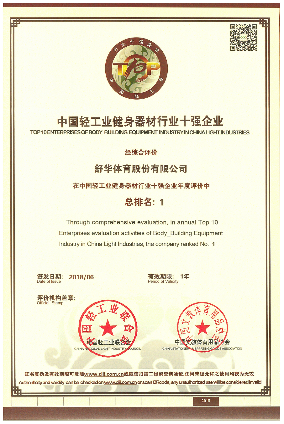 2017至2018年,vsport体育连续两年以第一名入围年度“中国轻工业健身器材行业十强企业”;2018年,vsport体育入驻平昌冬奥会“中国之家”,同年荣获“中国健身器材行业最具影响力品牌”。 From 2017 to 2018, Shuhua was named the "Top 10 Enterprise of Body Building Equipment Industry in China Light Industries " for the second consecutive year. In 20